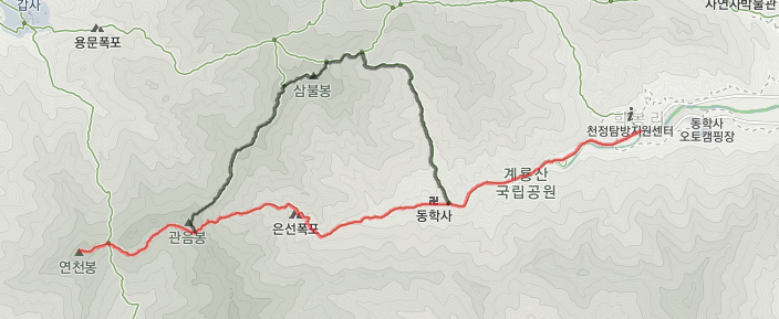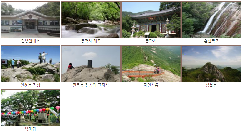 동학사 주차장에서 출발하여 동학사, 은선폭포, 연천봉, 관음봉, 자연성릉, 삼불봉, 남매탑을 돌아보는 탐방코스(편도 총 11.8km, 7시간 소요)입니다.