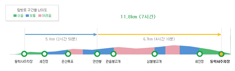 완만한 경사와 급한 경사 등 다양한 등산 난이도가 있는 코스며 대체적으로 바위나 돌계단이 많아 미끄러짐에 주의하면서 탐방해야 하는 코스입니다.
