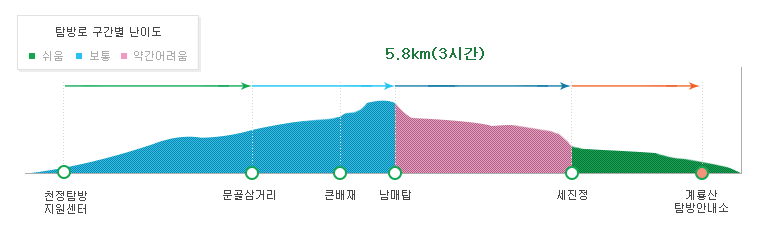 천정-남매탑 코스는 동학사를 거치지 않고 바로 계룡산을 탐방할 수 있는 코스로 작은 배재, 큰 배재를 지나 남매탑까지 갈 수 있으며, 전반적으로 탐방로 난도가 높지 않아 남녀노소 누구나 쉽게 오를 수 있으며 재미있는 전설이 있는 남매탑을 볼 수 있기 때문에 동학사를 거치지 않고 가벼운 산행을 원하시는 분께 추천하는 코스입니다.
