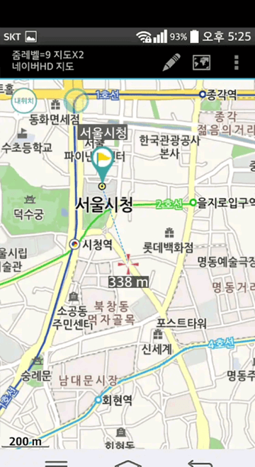 8. 내 위치 button을 길게 누르면 지도 중심 위치를 SMS로 전송(등산 중 119등에 긴급 구조 요청 시 사용 가능)