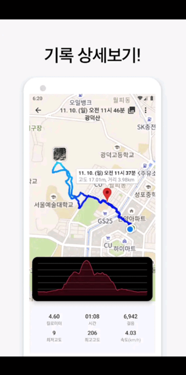산행 중 기록을 한눈에 볼 수 있으며, 친구와 함께 사진 보기도 가능합니다.