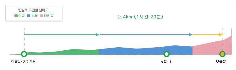 북한산 보국문 코스는 완만한 경사와 가파른 오르막길의 반복으로 이루어져 있어 산행 전 준비운동과 등산화 지참은 필수이다. 왕복 4.8km(소요시간 2시간 40분)로 입구로 되돌아오는 코스이므로 돌아올 수 있는 체력과 일몰시간 등을 고려하여 산행 계획을 수립한다.