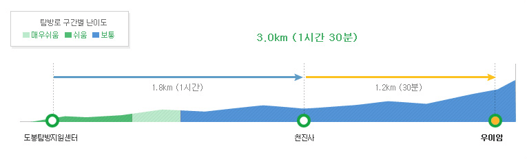 도봉탐방지원센터-우이암 코스는 완만한 경사의 등산 코스로 별다른 산행 준비가 필요하지는 않으나, 일부 구간 로프를 잡고 올라가는 구간이 있고, 왕복 5km(소요시간 2시간 20분)로 자신의 체력과 일몰시간 등을 고려하여 산행 계획을 수립한다.