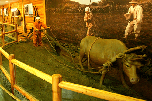 파종에서부터 수확할 때까지 사용하는 농기구인 따비, 쟁기, 곰배, 남테, 골갱이, 질메, 보리클, 산뒤클, 얼맹이, 멍석, 우장 등이 제주민속촌 전시관에 전시되어 있습니다.