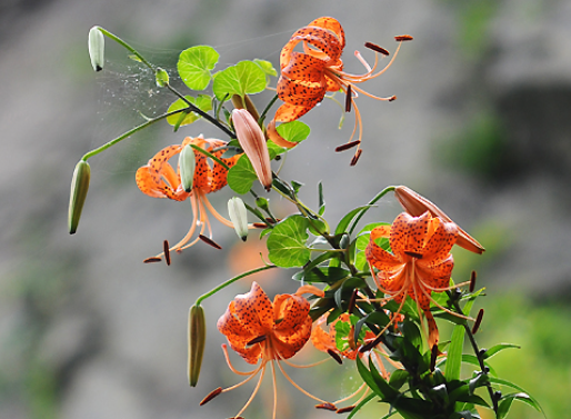 여름철에 피는 꽃은 화려한 오렌지색을 띠며, 꽃잎에는 검은 점이 산재해 있습니다.